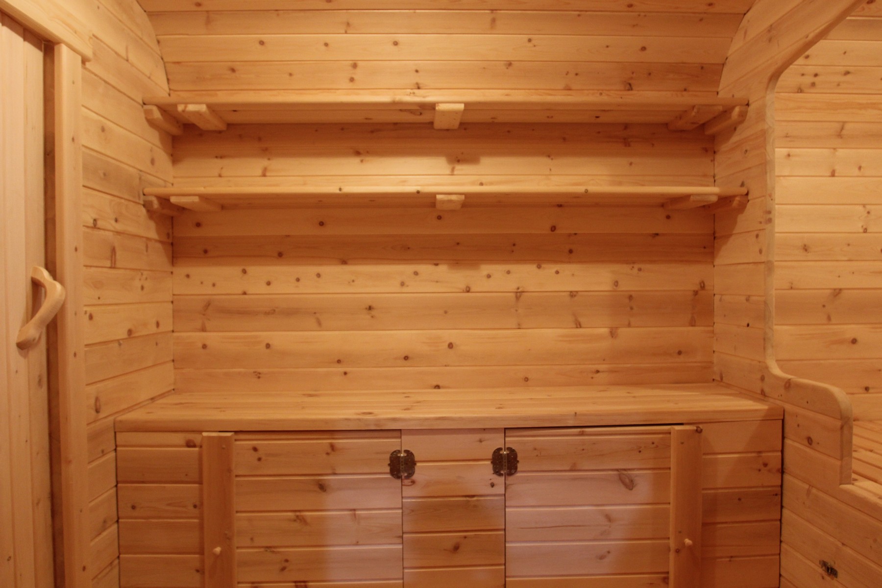 Обращаем Ваше внимание, что в стандартную комплектацию бани входят полки открытого типа в парной с обеих сторон. Дополнительно можно заказать полок закрытого типа или лавку!