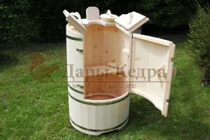 Круглая фитобочка из кедра - это мини парная, которую можно использовать не только в спа-салонах, но и дома. Такая модель наиболее компактна и мобильна. Толщина стенок составляет 40-45 мм, что позволяет увеличить срок службы изделия. Фитобочка оборудована откидными створками, дверцей и отверстием для головы. Верхний скос изделия делает положение головы более комфортным и улучшает обзор. Во время парения человек сидит внутри кедровой бочки, а голова находится снаружи. Благодаря этому исключается возможность перегрева. Подлокотники из кедра, встроенные ручки на створках и двери делают эксплуатацию более удобной.
