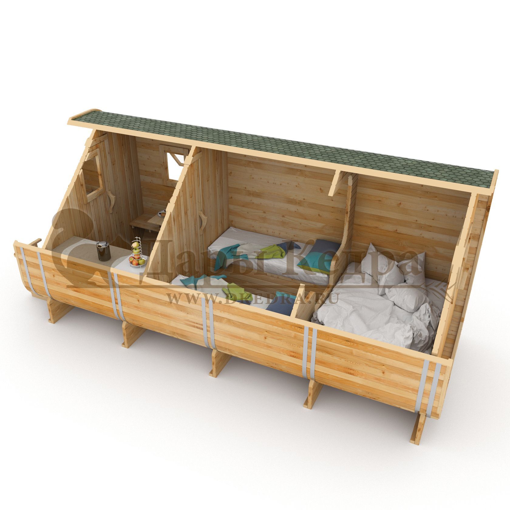 Кемпинг садовый домик «Дружный» Домик с тремя помещениями подходит для дачного использования в теплое время года или обустройства загородных баз отдыха. Прихожая и кухня занимают одну комнату, в которой стоит стол из кедра. Две другие оборудованы четырьмя деревянными лежаками, по желанию их можно заменить на двуспальные кровати. Либо обустроить санузлом и душевой зоной. Для удобства пользования кемпинг дом можно укомплектовать верандой с лавочками или козырьком.